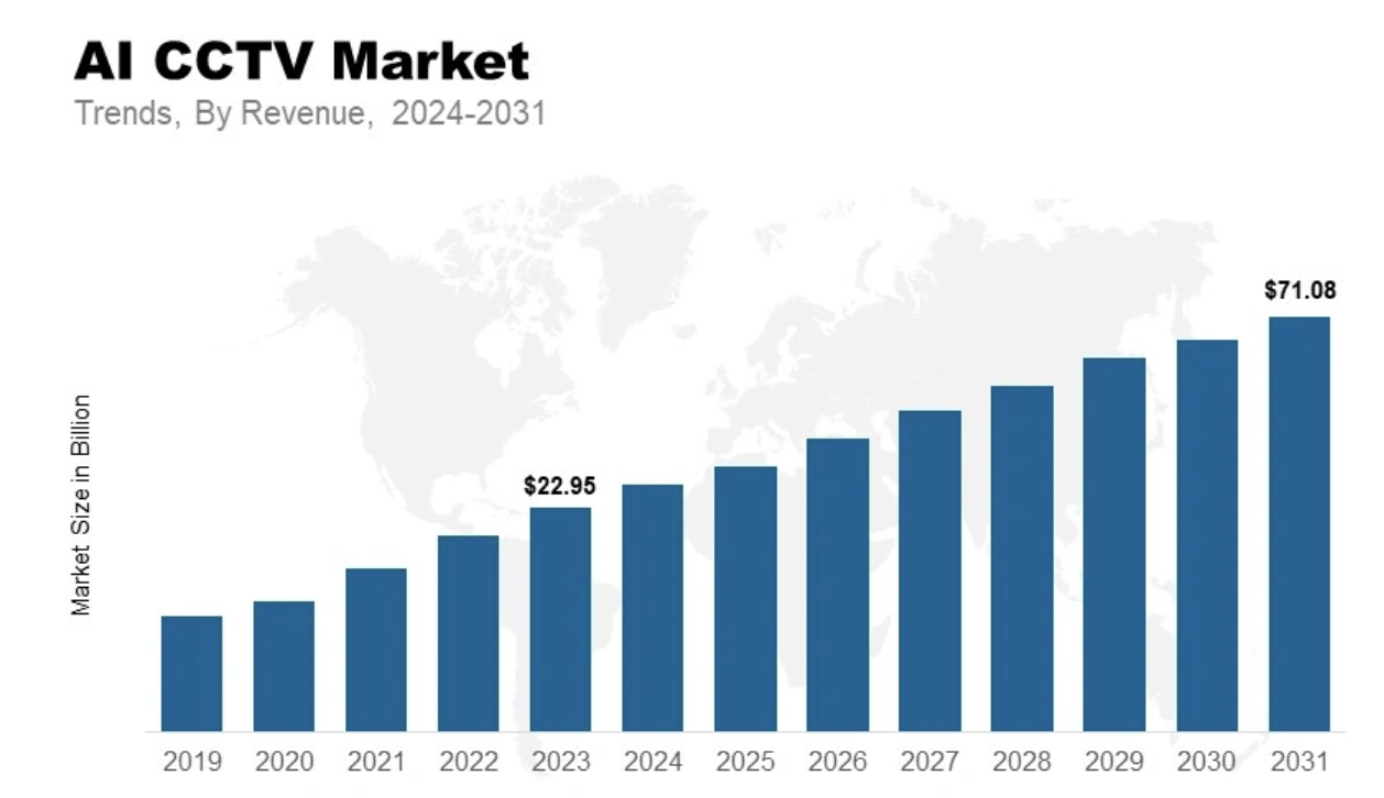 시장조사 기관 EXTRAPOLATE에 따르면, 글로벌 AI CCTV 시장 규모는 2023년 229억5000만 달러였으며, 2024년에는 266억3000만 달러로 증가할 전망입니다. 연평균 15.1%의 성장률을 기록하며 2031년에는 710억8000만 달러에 이를 것으로 예상됩니다.
