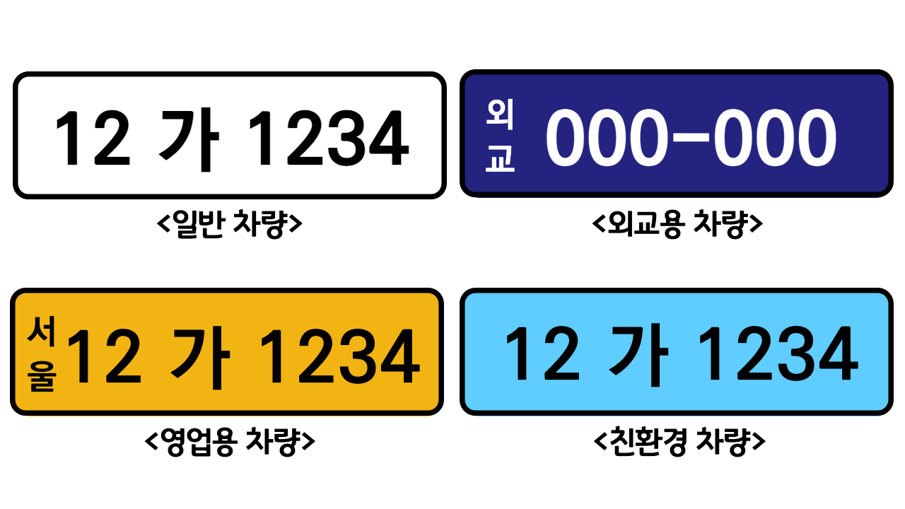 번호판 색상에 따라 차종을 구분할 수 있습니다. 우리가 자주 접하는 번호판은 흰색, 감청색, 노란색, 파란색 바탕의 종류인데요. 흰색은 일반 차량, 감청색은 외교용 차량, 노란색은 영업용 차량, 파란색은 친환경 차량입니다.