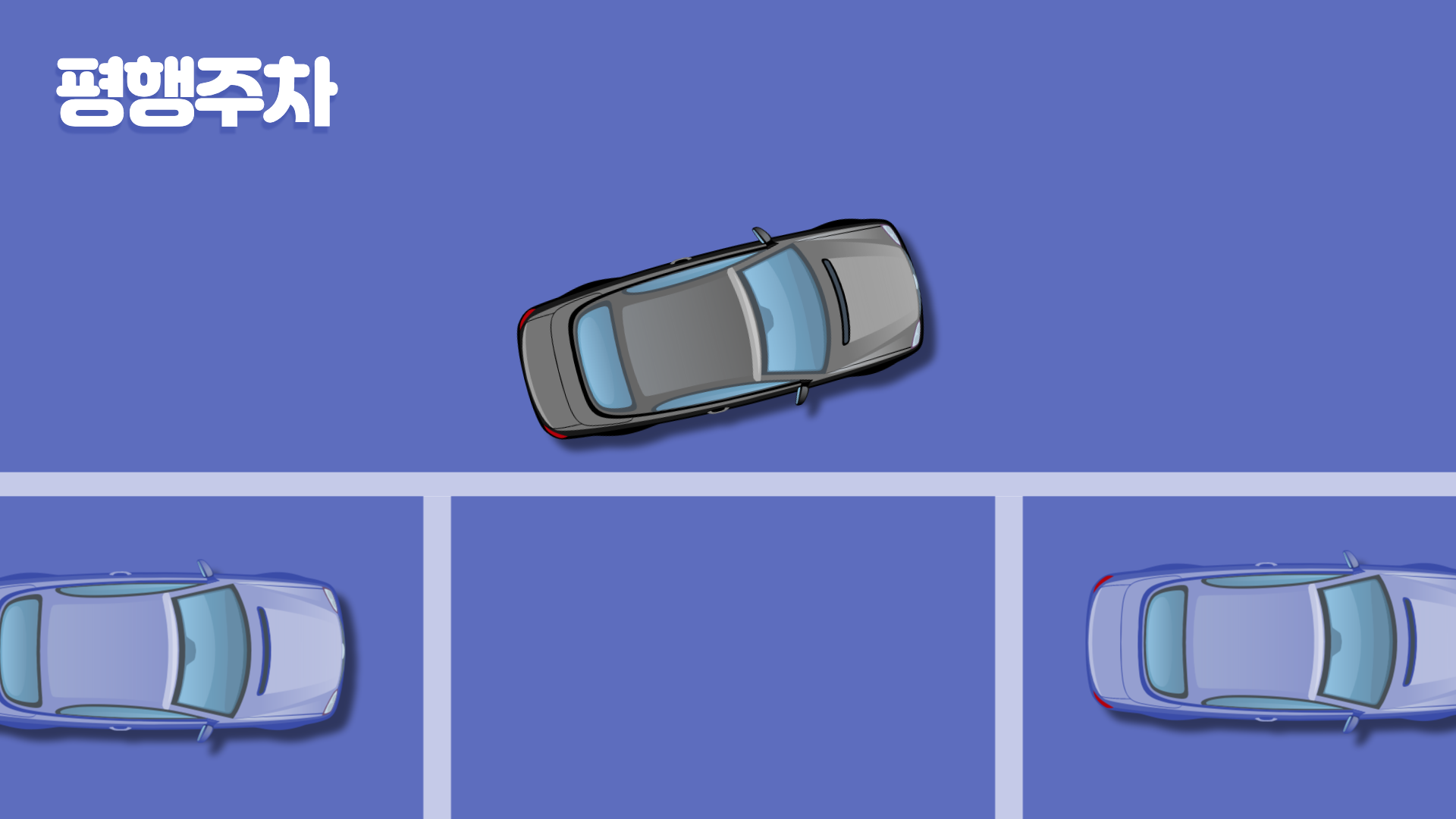 1) 주차할 공간의 앞 차량과 평행으로 1m 정도 간격을 두고 진입합니다. 앞 차량과 내 차의 뒤 범퍼가 일직선상에 놓였다고 생각되면 정지합니다.