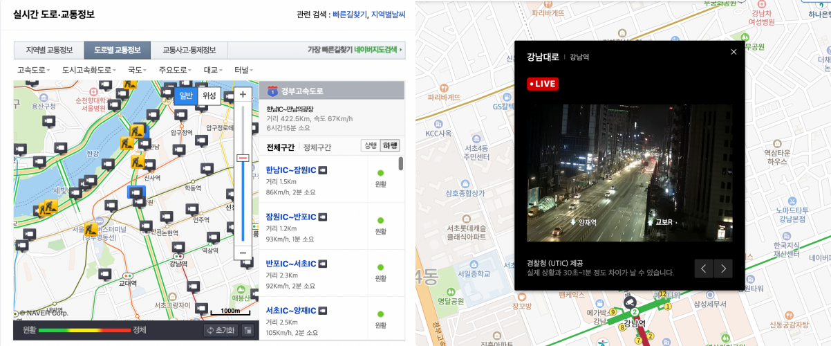 경찰청의 도시교통정보센터(UITC)는 전국 도로에 설치된 CCTV 영상을 제공하고 있습니다.